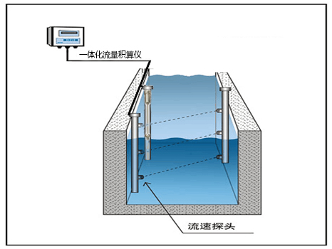 流量測量原理是在規則的某處斷面,實時檢測通過該斷面的不同水層的流速,通過多次采集,而后通過數據建模方式得出平均流速。結合該斷面的結構形式(如:梯形渠、U型渠和矩形等)和當前水位,依據《水力學》的計算公式,適當的修正粗糙系數,最終計算出該斷面的瞬時流量,一般以5分鐘為時間單位頻率,若特殊需求,可提高采集頻率,以便達到更高的精準度。